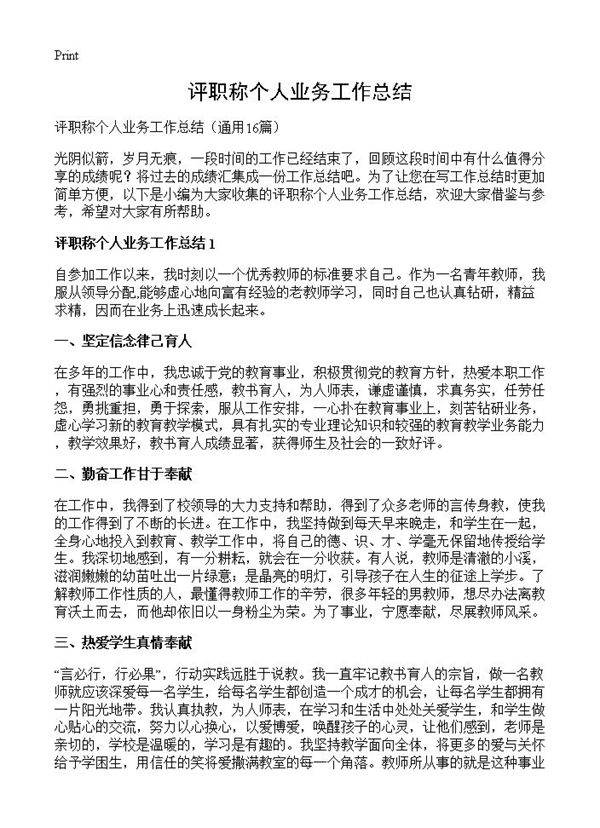 在职称评审过程中,个人业务工作总结是对自身专业能力、工作业绩和职业发展的全面梳理与展示。本总结围绕任职期间的工作职责、业务成果、学术研究、团队协作及社会贡献等方面展开,系统回顾了个人在专业领域的成长历程,重点突出了在技术攻关、项目创新、人才培养等方面的突出表现,同时结合行业发展趋势,对未来的职业规划进行了展望。通过客观详实的数据和案例,充分展现了个人在专业领域的综合素养与竞争力,为职称评审提供有力支撑。
