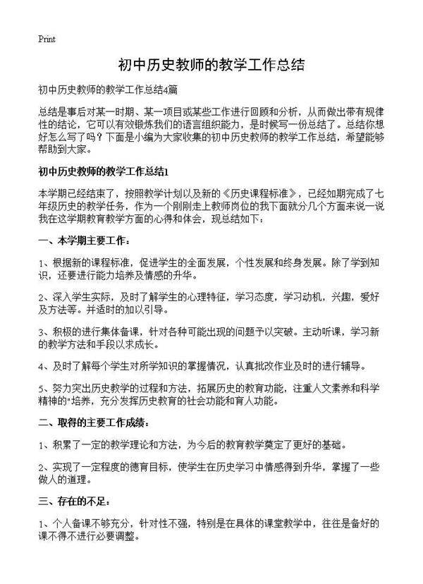 初中历史教师的教学工作总结 (共6页) 【免费下载】