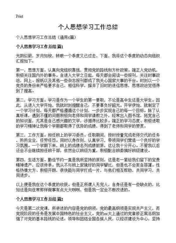 个人思想学习工作总结是对一段时间内个人在思想觉悟、学习成果和工作表现等方面的全面回顾与反思。它旨在梳理个人在思想上的成长与进步,总结学习过程中的收获与不足,分析工作中的成绩与经验,从而明确今后努力的方向和目标。通过撰写总结,可以更好地认识自我,提升综合素质,为下一阶段的发展奠定基础。