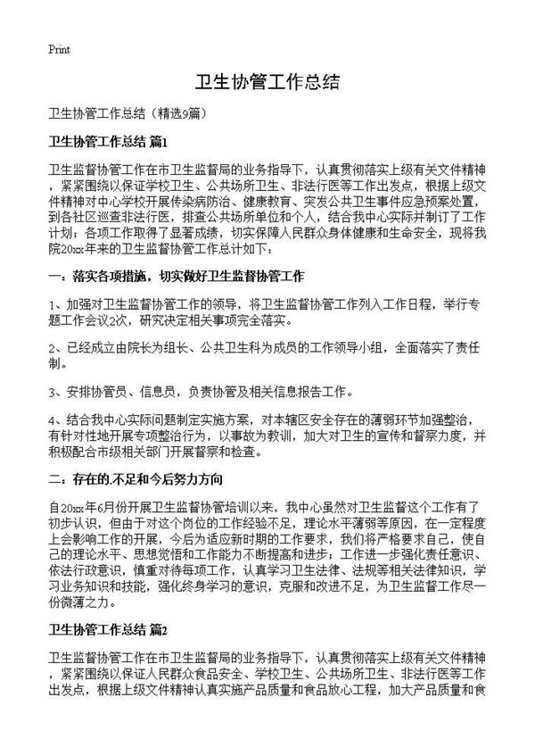 卫生协管工作总结是对一段时间内卫生协管工作的全面回顾与评估,旨在梳理工作成效、分析存在问题并提出改进措施。通过总结,可以系统性地整理卫生协管在监督巡查、宣传教育、问题整改等方面的工作成果,同时反思工作中的不足与挑战,为下一步工作提供参考依据。总结内容通常包括工作目标完成情况、重点任务执行效果、典型经验做法以及未来工作计划等,有助于提升卫生协管工作的规范性和实效性,更好地服务群众健康需求。