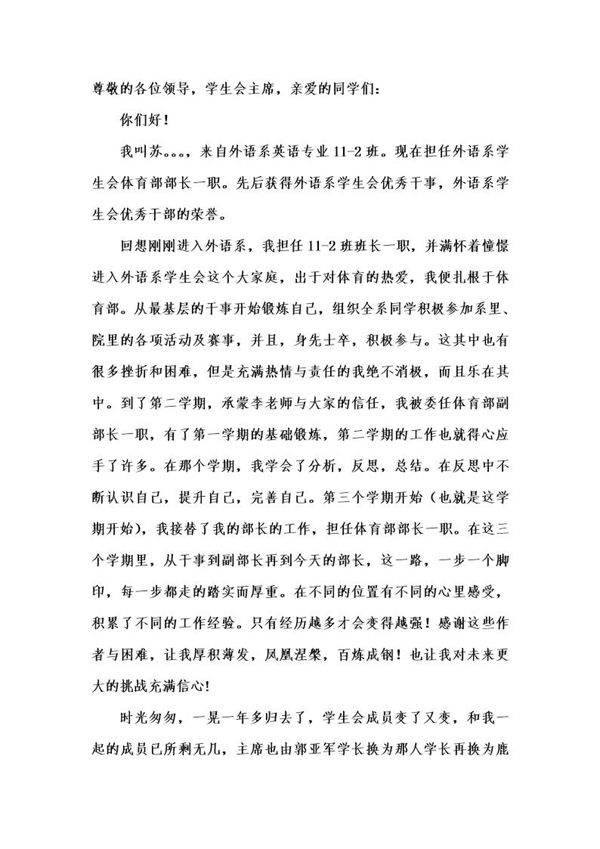 尊敬的各位老师、亲爱的同学们:大家好!我是来自XX学院的XXX,今天怀着无比激动的心情站在这里,竞选学生会主席一职。作为学生会的一员,我深知责任重大,也明白这份工作需要的不仅是热情,更是担当与行动力。在过去的学生工作中,我积累了丰富的组织协调经验,锻炼了沟通与解决问题的能力。如果我有幸当选,我将以服务同学为宗旨,搭建师生沟通的桥梁,推动校园文化建设,倾听大家的需求,为同学们创造更优质的学习与生活环境。我坚信,团结协作的力量可以让我们走得更远。无论结果如何,我都会继续为学生会贡献自己的力量。希望大家能给我一个机会,让我与大家携手,共同书写学生会新的篇章!谢谢大家!