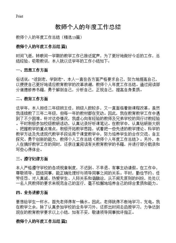 教师个人的年度工作总结是对过去一年教育教学工作的全面回顾与反思。它通常包括教学任务完成情况、学生成绩分析、个人专业发展、参与教研活动、班级管理成效以及存在的不足与改进方向等内容。通过总结,教师能够梳理工作成果,提炼经验教训,明确未来目标,为下一年的工作规划提供依据,同时也为学校考核和个人职业发展提供重要参考材料。